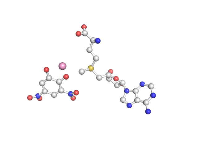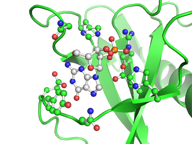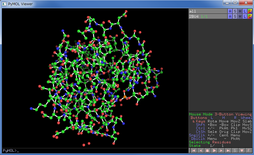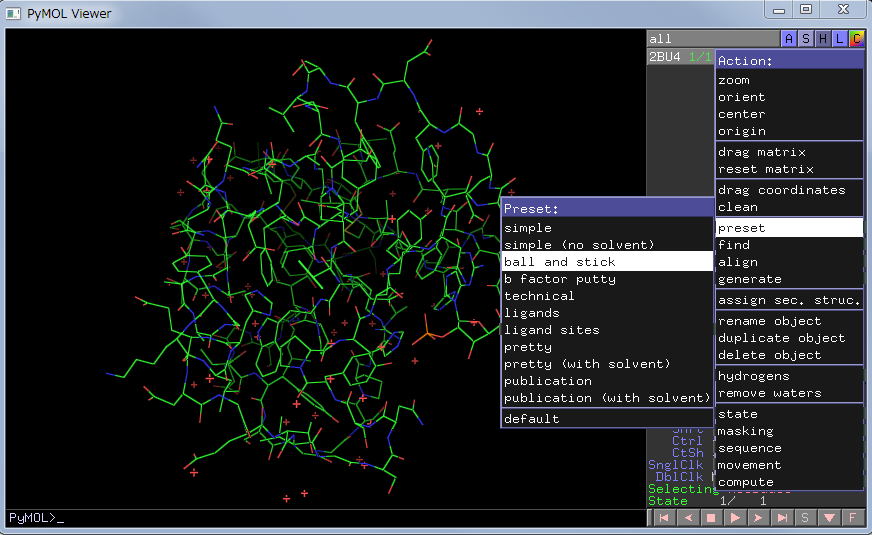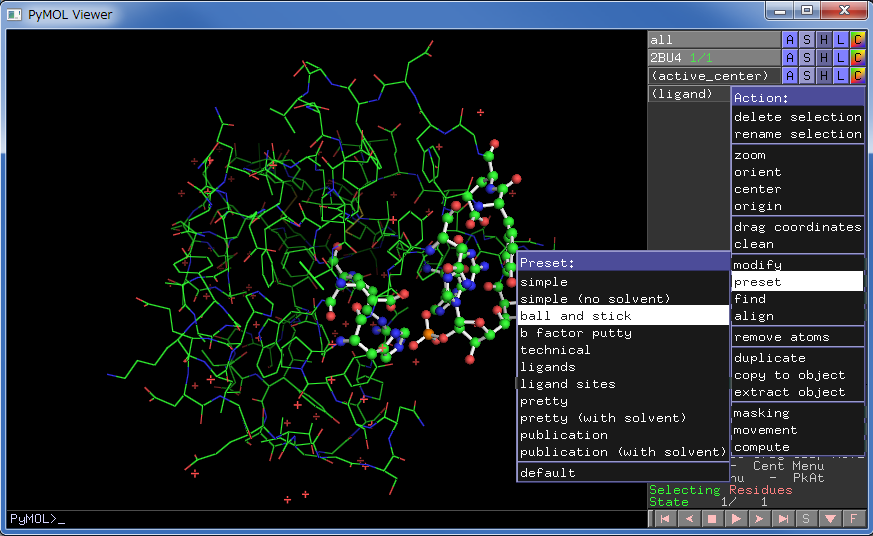 例としてリガンドと側鎖をボール&スティックモデルで表示してみます。例ではPDB ID:2BU4を使用しています。
