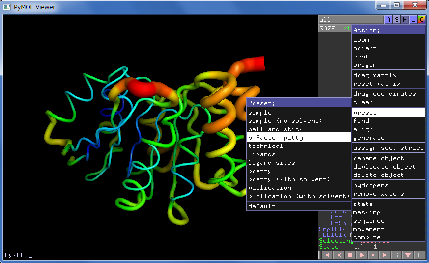 温度因子(B factor)によって色や表示を変えてみます。温度因子は原子の揺らぎを表現する量で、温度因子が大きいほど結晶内での動きが大きい原子となります。