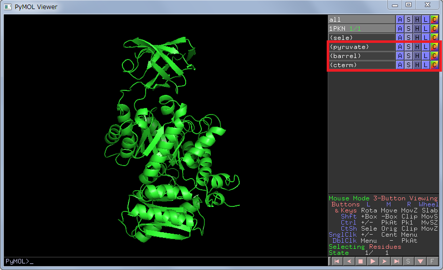 例としてマルチドメインタンパク質をドメインごとに色を変更してみます。chainごとの色分けは簡単ですが、 ドメインの場合は1つのchainなので、別々に指定する必要があります。