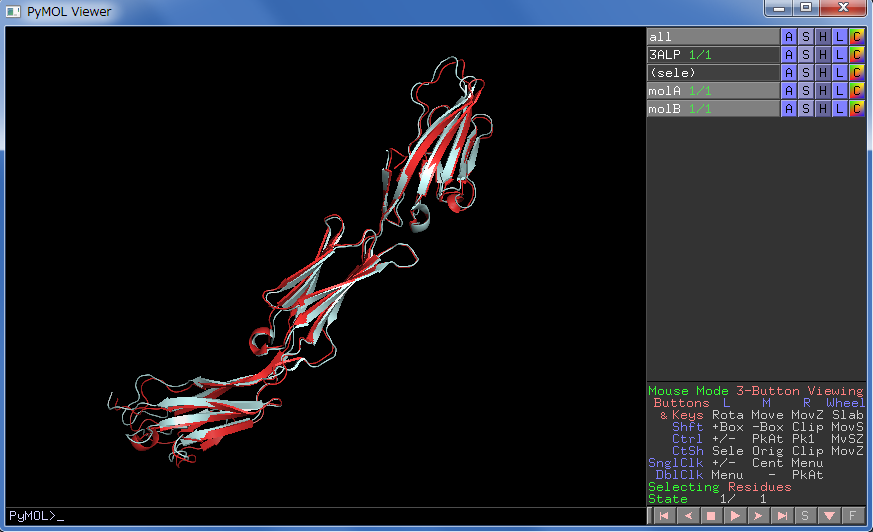 例とし非対称単位中に存在する分子を重ね合わせてみます。PDB ID:3ALPは非対称単位中に2分子存在します。 chain AをmolA、chain BをmolBとして複製して、重ね合わせます。