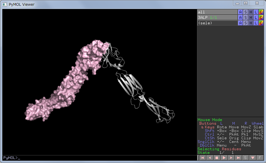 対象を入力して一部を表示することもできます。例えば、すべて非表示にしてchain Aをcartoonで、chain Bを surfaceで表示してみます。