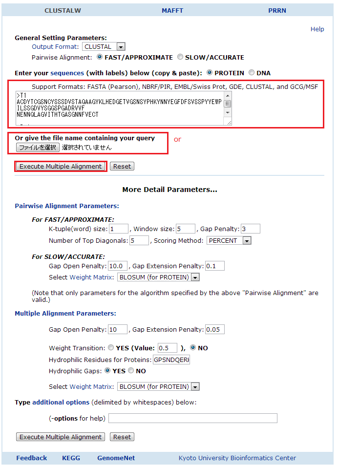 で比較したいアミノ酸配列をまとめたFASTAをアップロードするか、 テキストを貼り付けます。
