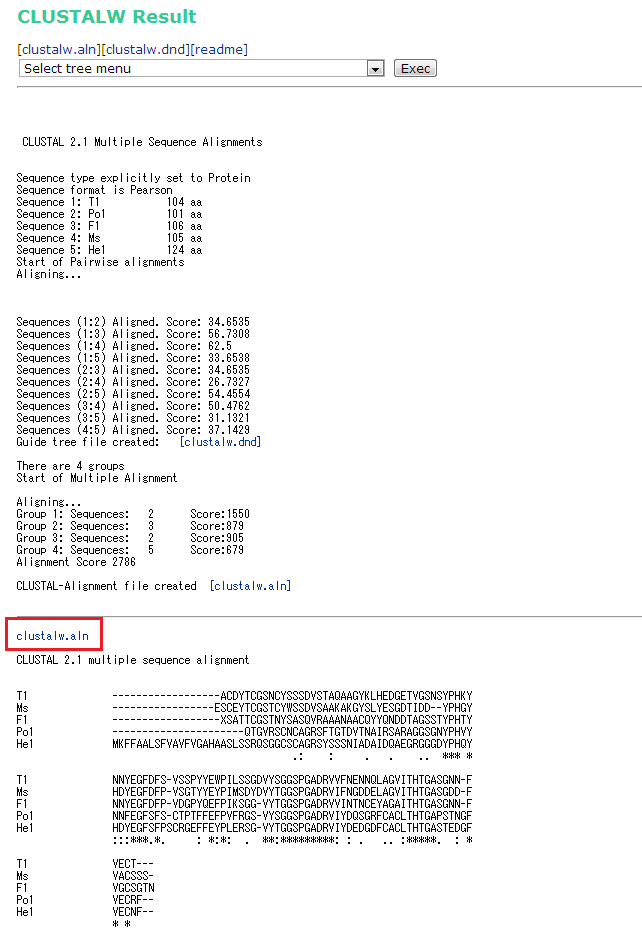 例ではT1タイプのRNase、T1/Po1/He1/Ms/F1の5つの保存性をT1(PDB ID:2B4U)に色をつけます。