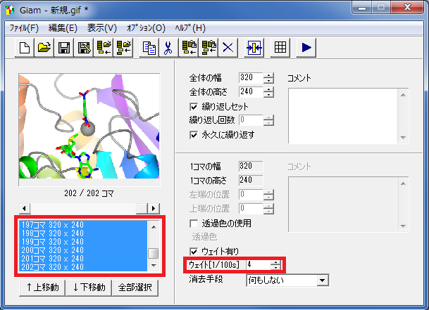 各フレームの時間を個別に設定することも、まとめて変更することもできます。フレームをすべて選択して青い状態にします。