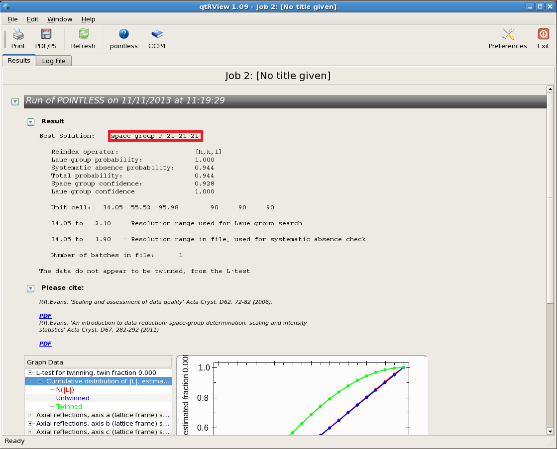 pointlessで決定する方法とPhaser(分子置換プログラム)で空間群を決定します。例ではとりあえずP222で処理したデータの空間群を決定してみます。