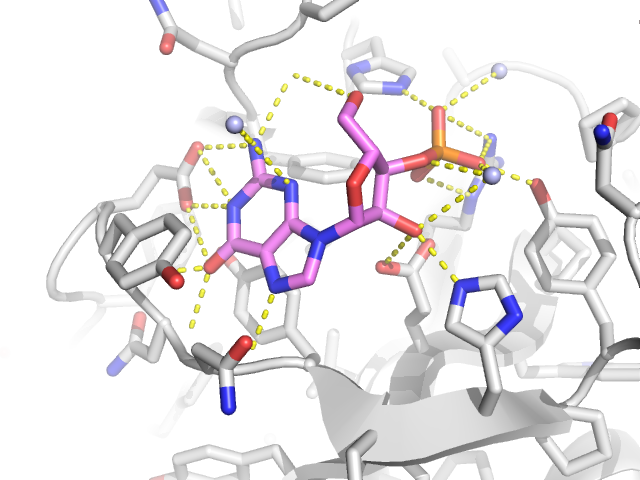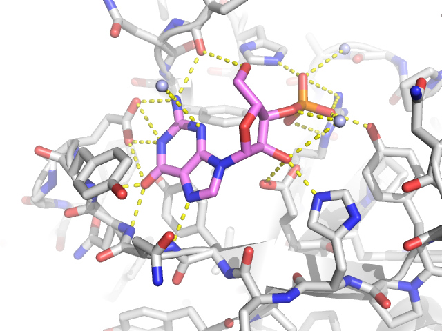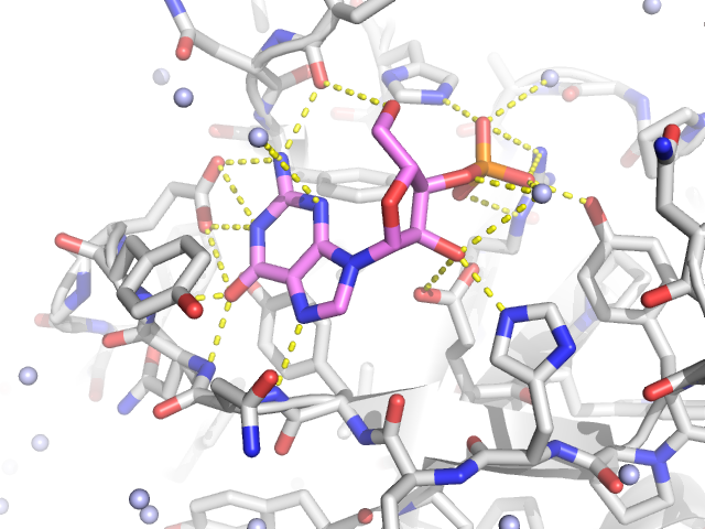 例ではRNaseと3'GMPの複合体です。RNaseと3'GMP間の水素結合を表示してみます。