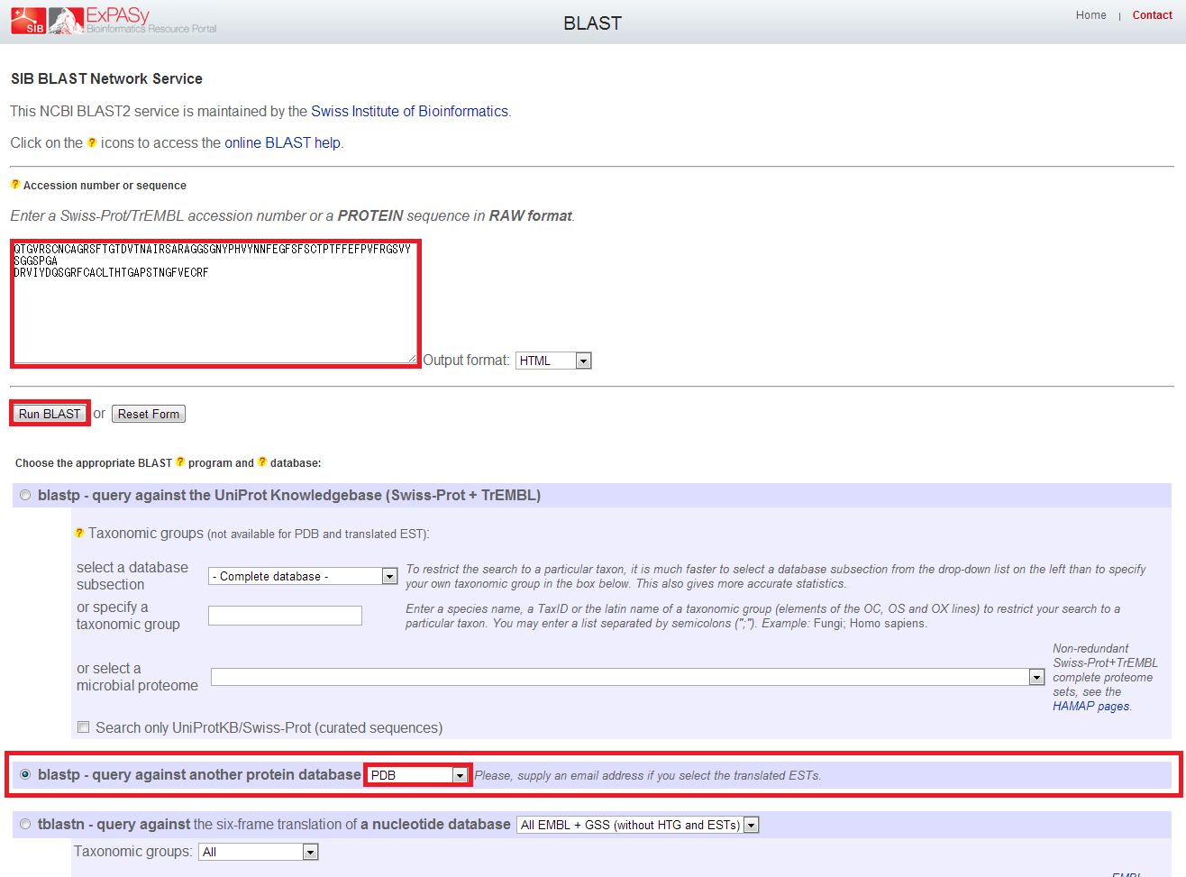 アミノ酸配列を入力し、中央の "blastp - query against another protein database" にチェックして、 プルダウンメニューから "PDB" を選択