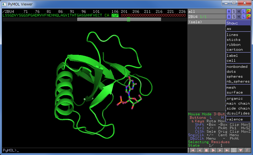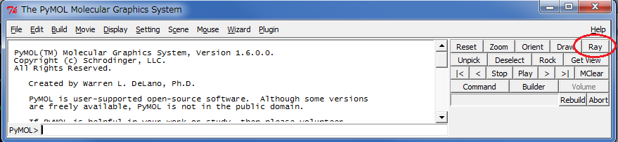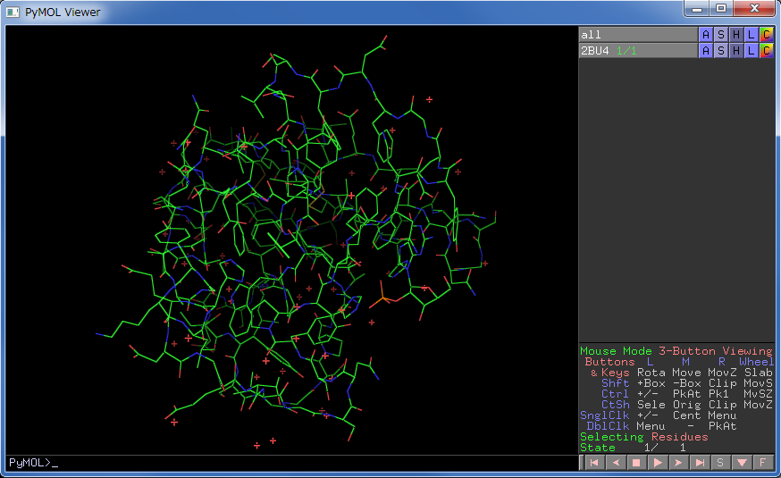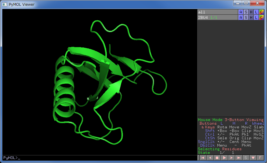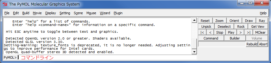 PyMOLはExternal GUIとViewerの二つのウィンドウから構成され、マウスによる操作に加え、コマンドラインによる操作が可能です。