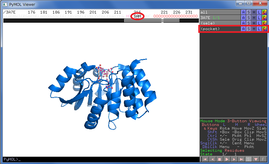 以下のコマンドを使用します。"samの周辺8 Åをpocketという名前で選択する" という意味です。