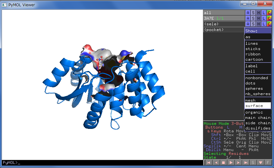 例にはPDB ID:3A7Eを使用しています。また、リガンドをボール&スティックモデルで表示しています。