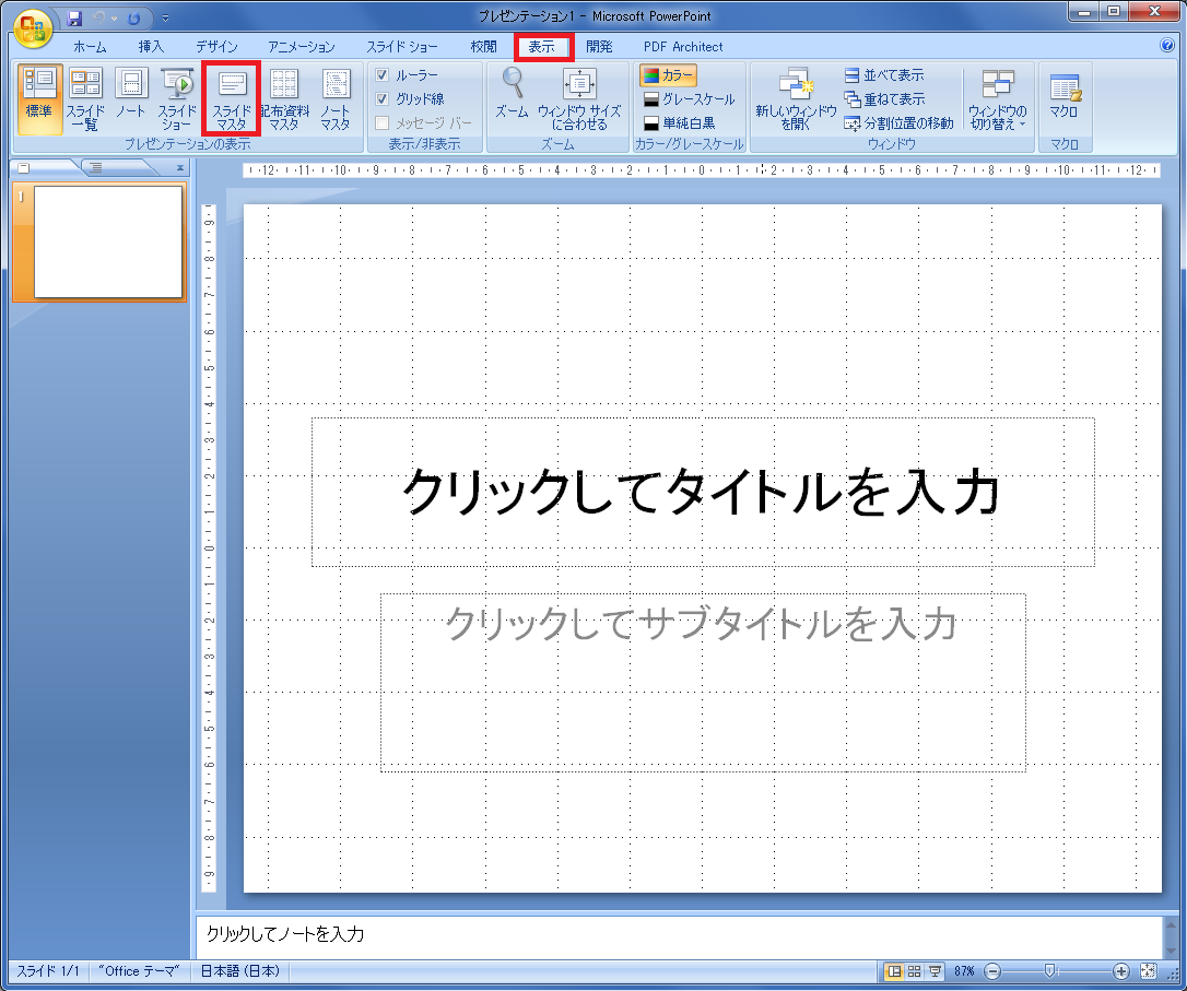 説明ではPowerPoint2007を使用します。テンプレートの作成にはスライドマスタという機能を使います。 スライドマスタの開きかたは、"表示 → スライドマスタ"です。