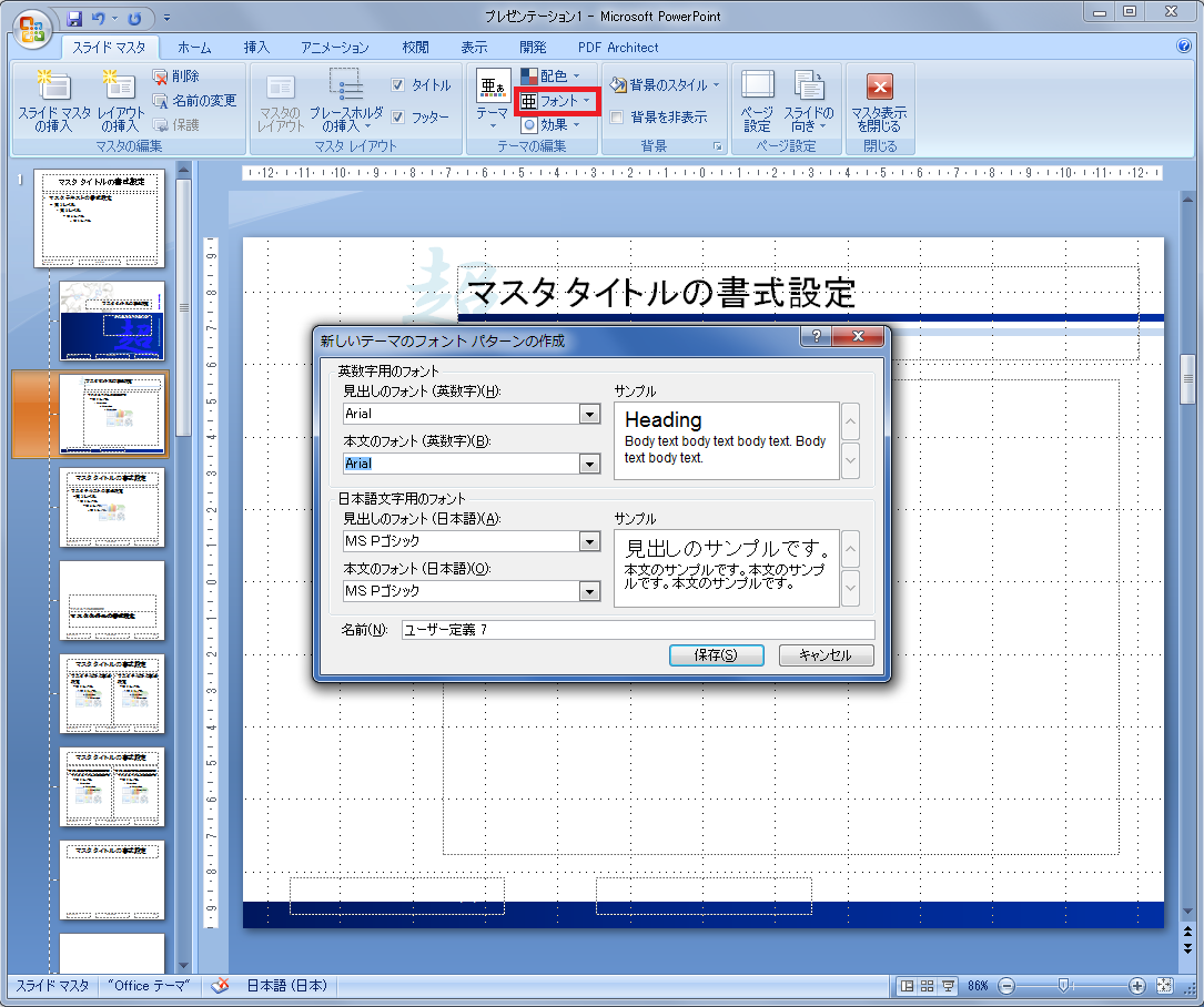 "スライドマスタ→フォント→新しいフォントパターンの作成"で変更します。英数字と日本語を別々に選択することも可能です。 個人的には、英数字:Arial、日本語:MS Pゴシックが好みです。